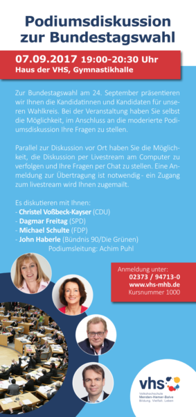 Zur Bundestagswahl am 24. September präsentieren wir wir Ihnen die Kandidatinnen und Kandidaten für unseren Wahlkreis. Bei der Veranstaltung haben Sie selbst die Möglichkeit, im Anschluss an die moderierte Podiumsdiskussion Ihre Fragen zu stellen.