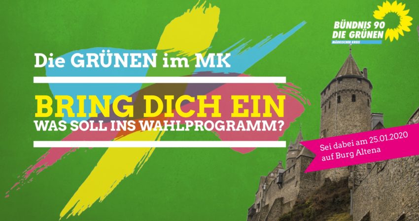 Wir laden alle an grüner Politik Interessierten (auch Nicht-Mitglieder) herzlich ein an unserer Veranstaltung auf Burg Altena teilzunehmen und uns bei der Erstellung unseres Wahlprogrammes zu unterstützen.