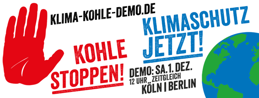 Im Dezember geht es gleich doppelt ums Klima. Während in Polen über die Umsetzung des Pariser Klimaabkommens verhandelt wird, geht es in Berlin um den Kohleausstieg. Daher findet am 1. Dezember in Köln und Berlin die Demo „Kohle stoppen! Klimaschutz jetzt!“ statt.